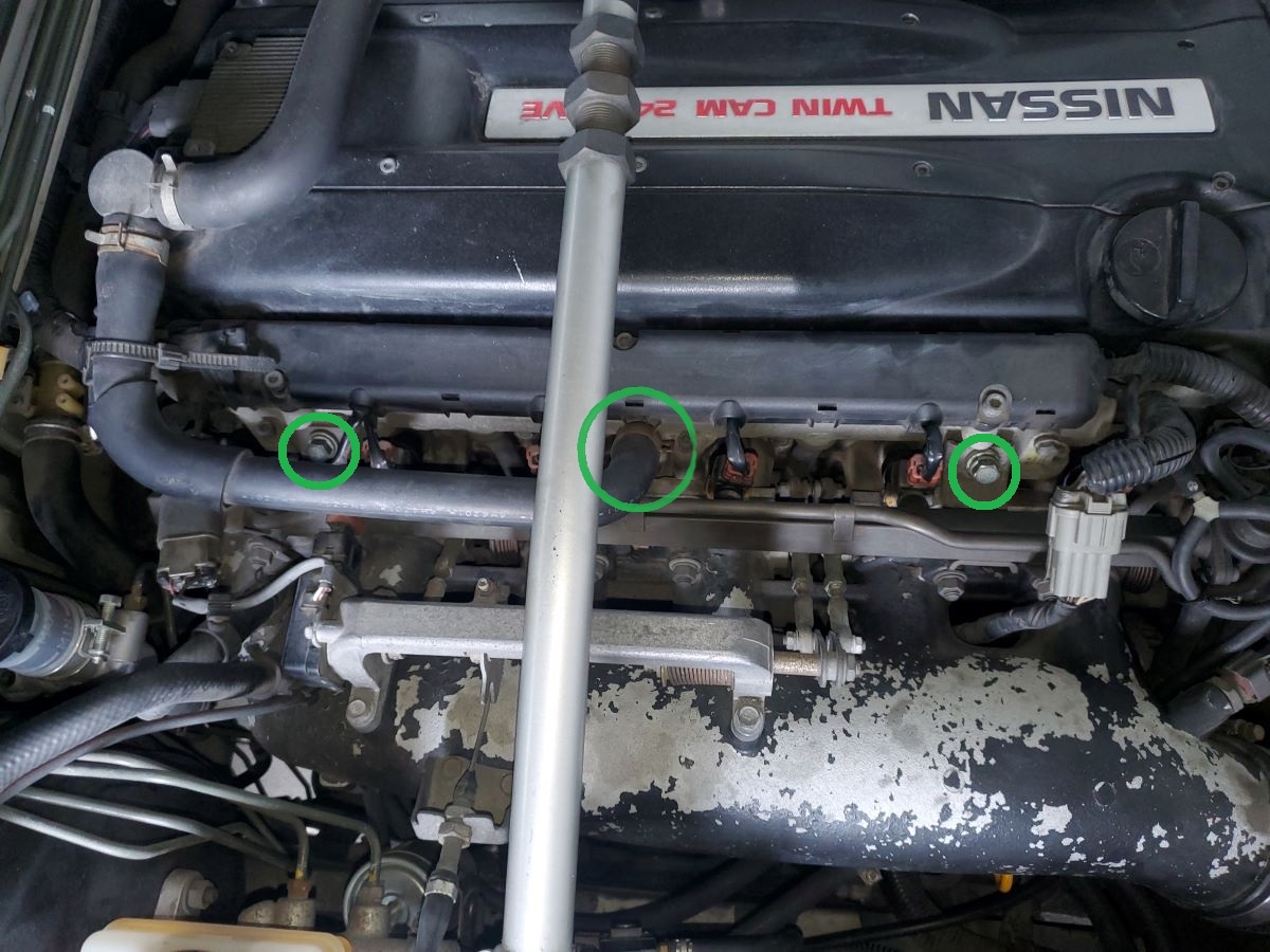 Alright, let’s get to it. The hose in the middle you can unclamp just to get it out of the way. I tucked it behind the clutch cylinder. The two bolts on the left and right hold the fuel rail in place you’ll need to remove both as well.