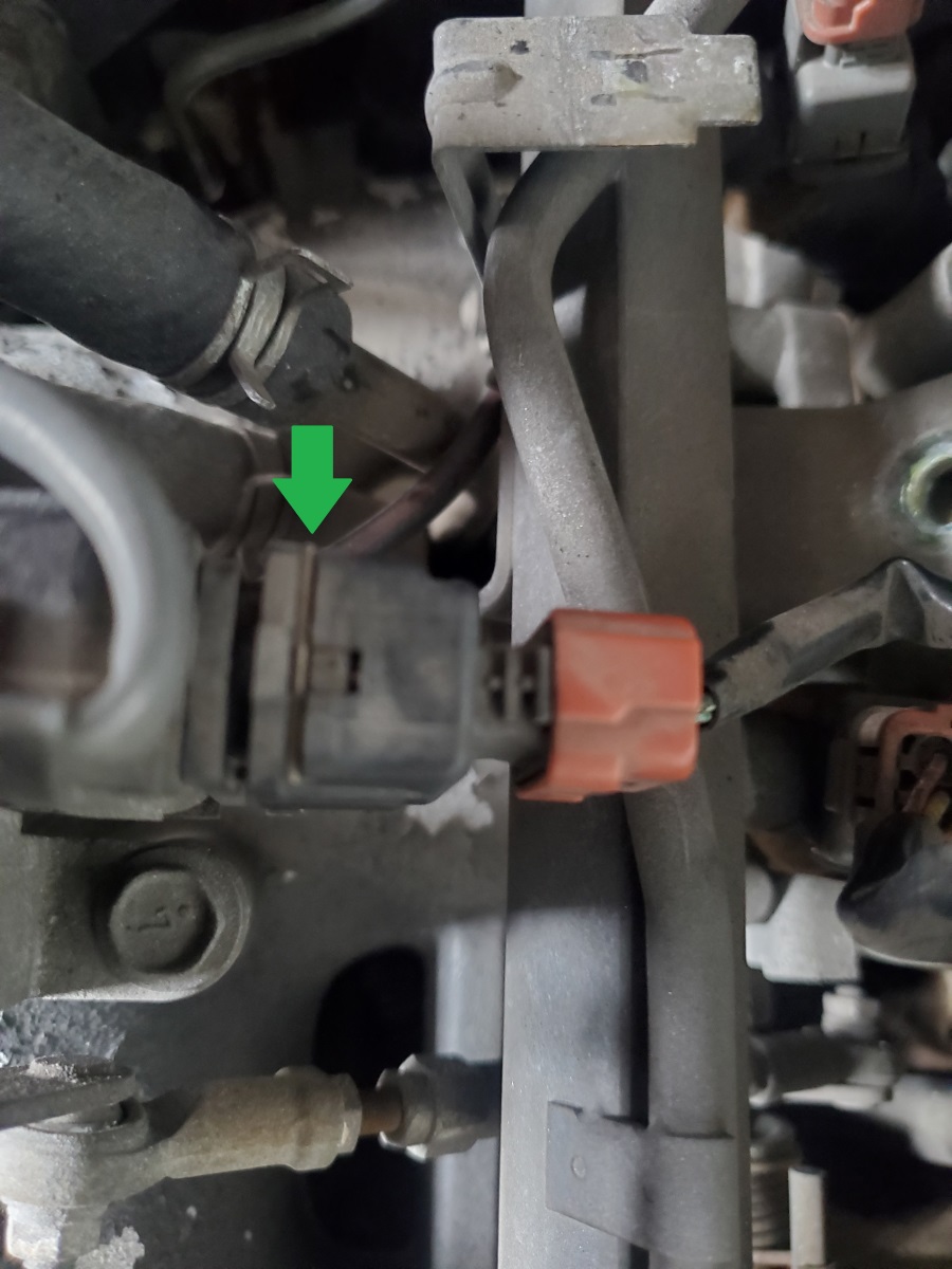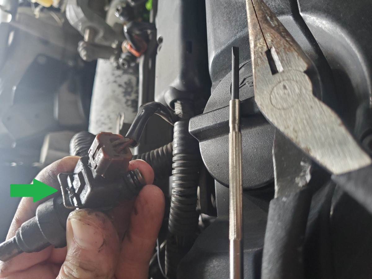 Be careful removing these pins shown by the green arrow in the picture. They are tension loaded and will spring into the abyss that is your engine bay if you let them. I used a small flat head to pry them over the lip and pull them out just a little. Use a pair of needle nose pliers to hold on to them as you pull them off. There is one (big) clip for this connector and there are six (small clips) on each injector.