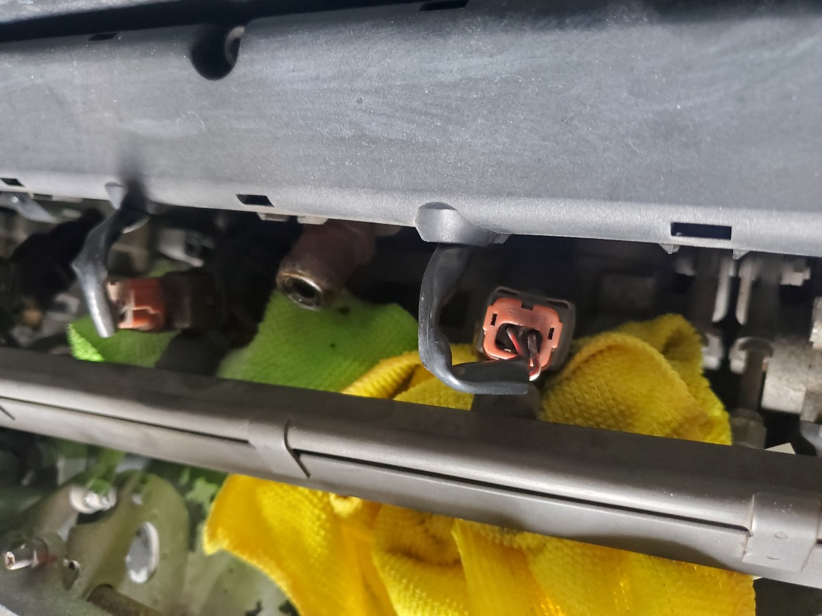 After you remove the top two old rings and put in the new rings, you are ready to install the injectors back into their homes. After you fit them all into the fuel rail, plug their connectors, push the pin back down and over the locking nub.